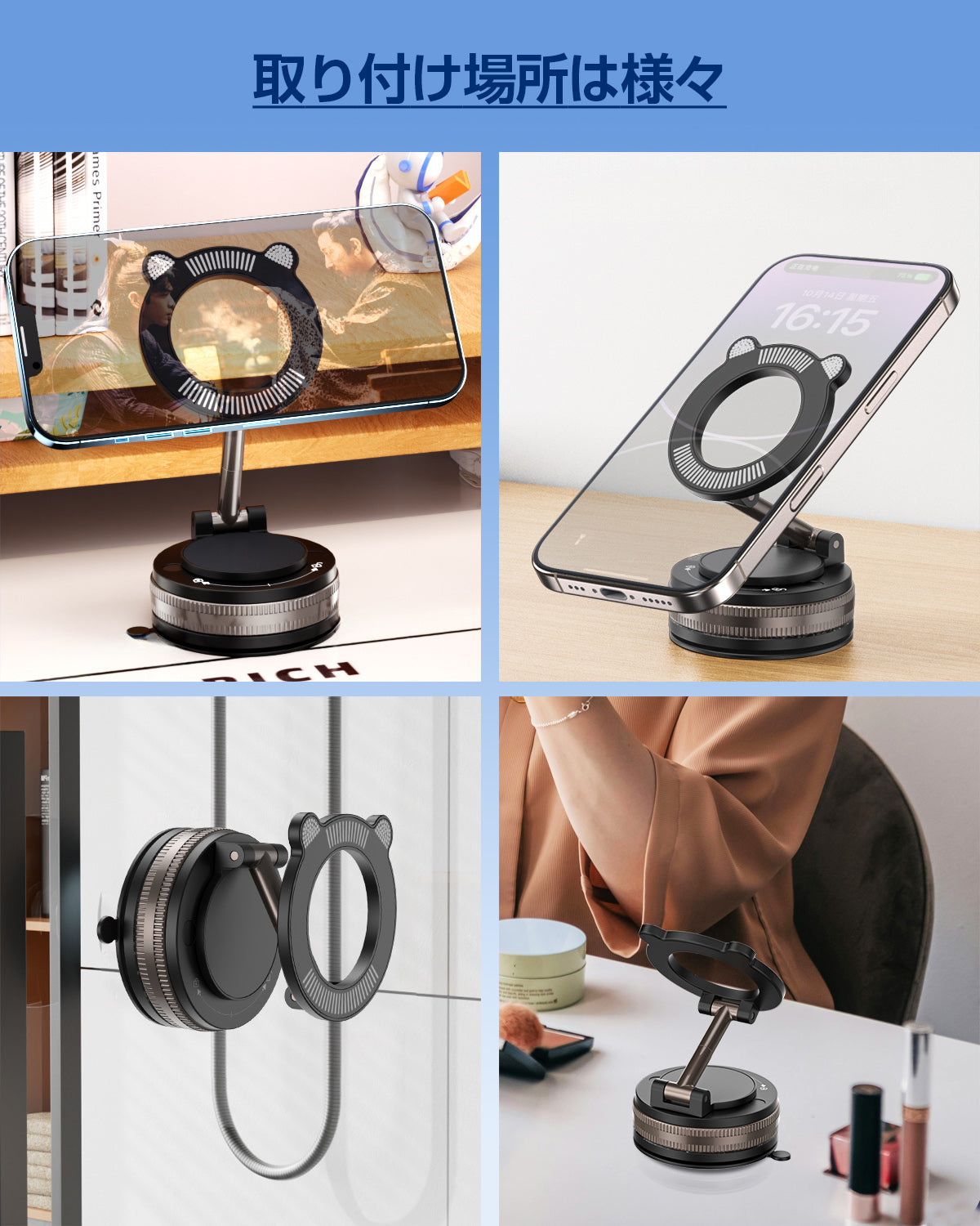 スマホホルダー 車 マグネット【24×N55磁石+真空吸盤】360度多角度調節 Mag-safeホルダー 片手操作 1秒で着脱 高級合金素材 スマホスタンド 車載スマホホルダー 携帯ホルダー 折りたたみ式 ナノゲル吸着 iPhone&Android多機種と多車種対応