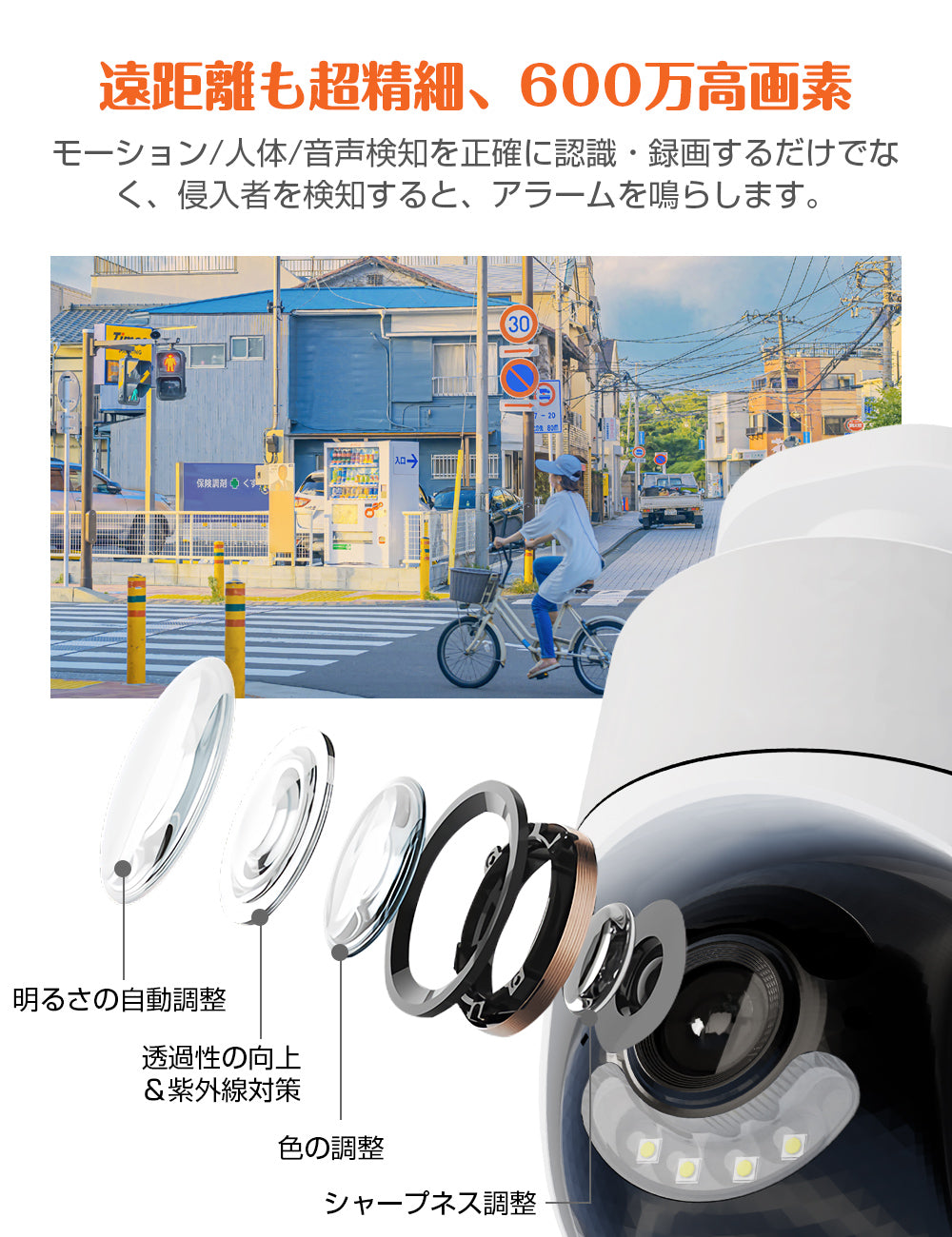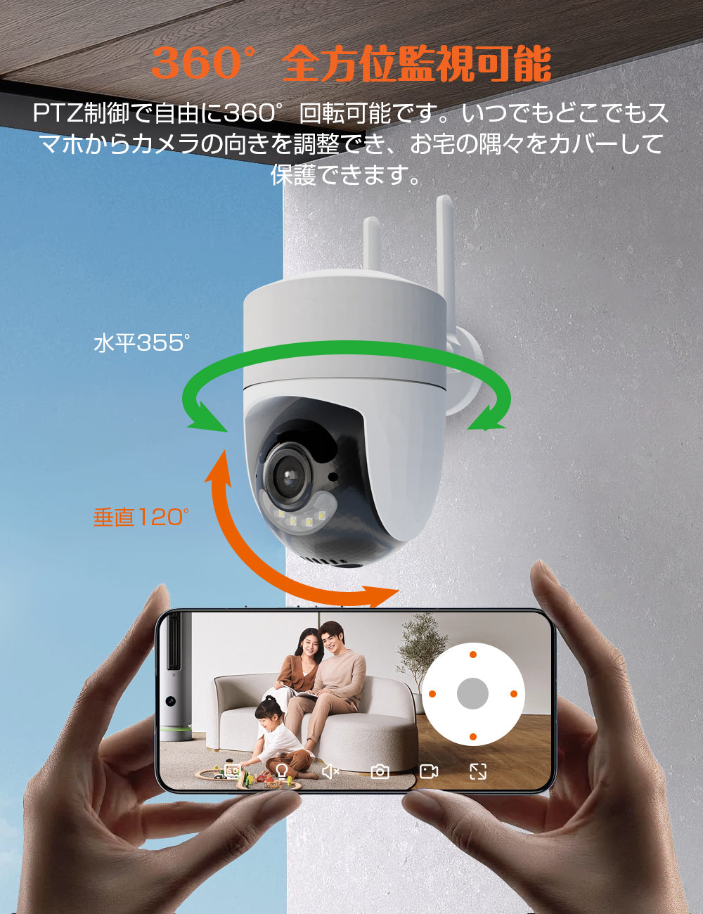 - 「パンチルト機能・360°監視・自動追跡」PTZ搭載、左右355°垂直120°可動広範囲視野、屋内屋外の隅々まで見守りします。自動追跡機能あり、アプリでオン・オフ可能。ペットの動き、子供の走りも、老人の歩幅も追いついて来ます。画面で相手を見失うことはない。また人体検知/サウンド検知/モーション検知あり、検知のタイプや時間をカスタマイズ設定、誤検知も最大に避けます。